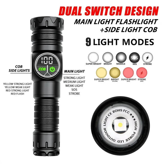 LED High Power Led Flashlights Rechargeable Camping Spotlight with Side Light 9 Lighting Modes for Camping Adventure Outdoor