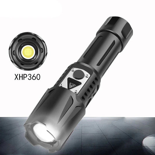 مصباح يدوي XHP360 LED 26650 قابل لإعادة الشحن USB مصباح يدوي تكتيكي قوي قابل للتكبير والتصغير ومصباح يدوي مقاوم للماء للصيد