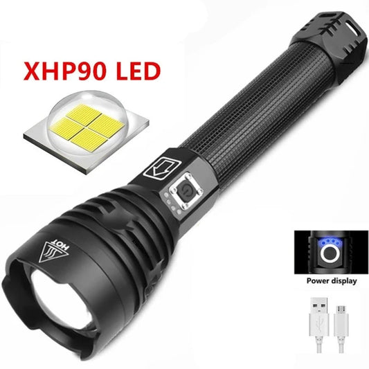مصباح يدوي XHP90 LED 26650 USB قابل لإعادة الشحن مصباح يدوي تكتيكي قوي قابل للتكبير والتصغير ومصباح صيد مقاوم للماء