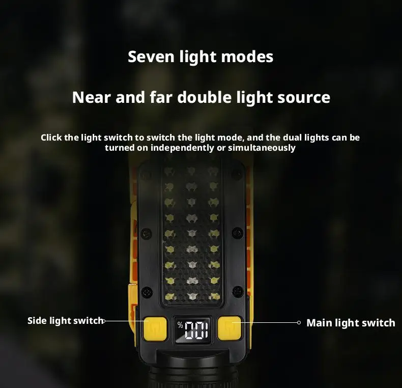 The ZHENAO X66 is a versatile LED work light engineered for professionals and outdoor enthusiasts. Featuring 30W of mixed-spectrum illumination—including 20 white LEDs, 4 red, 4 blue, and 2 purple LEDs—this flashlight delivers adaptive lighting for inspection, maintenance, and emergency detection tasks. The dual-switch system provides independent control: the main switch cycles through strong, weak, and flash modes, while the side switch manages white intensity levels and specialized color modes for detection work. Built with durable ABS construction and IPX4 waterproof rating, it withstands demanding environments. The integrated 1800mAh battery charges via Type-C USB with power output capability, ensuring extended runtime. Weighing just 155g in a compact 13.5×5.5×3.5cm form factor, it's designed for portability without sacrificing performance.