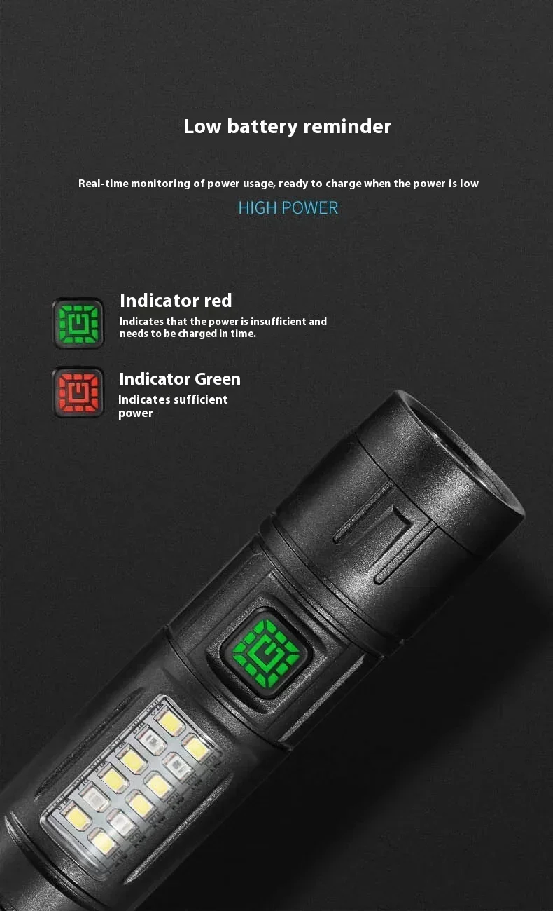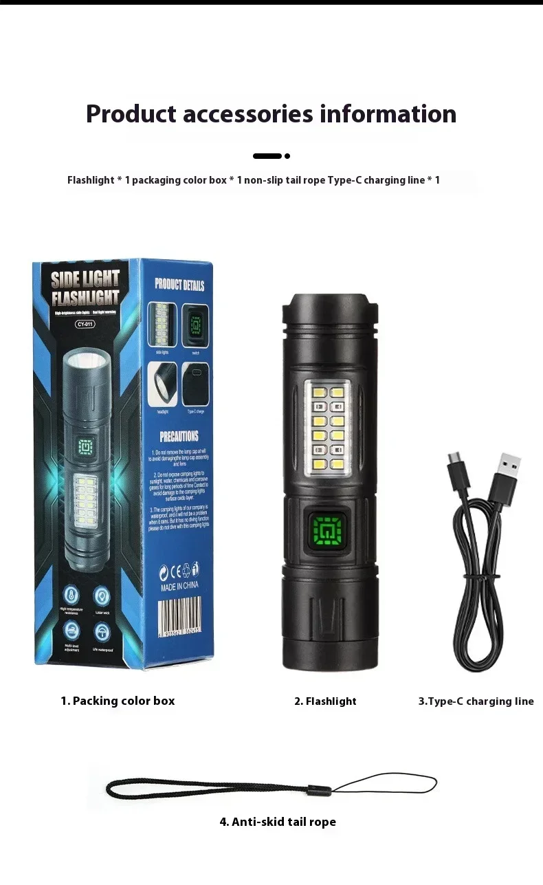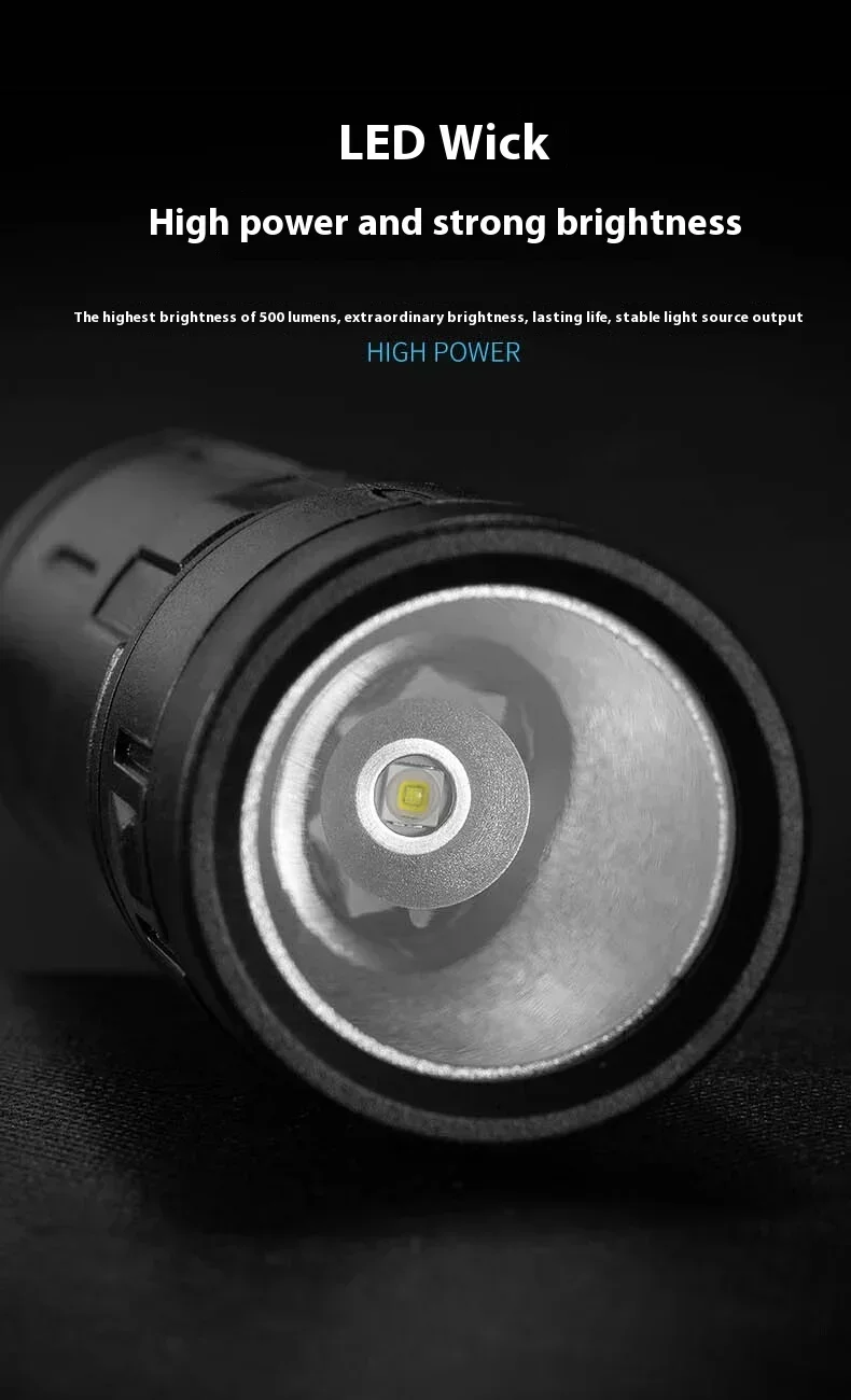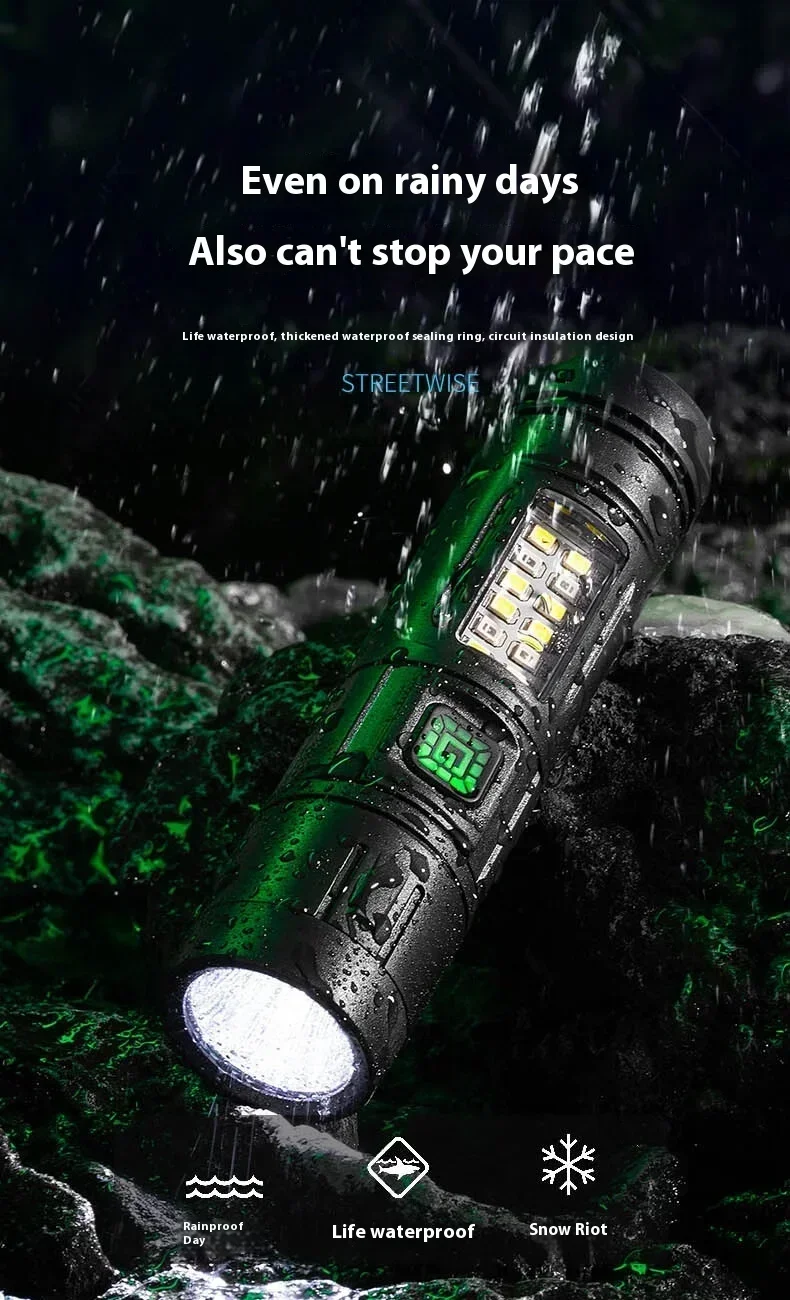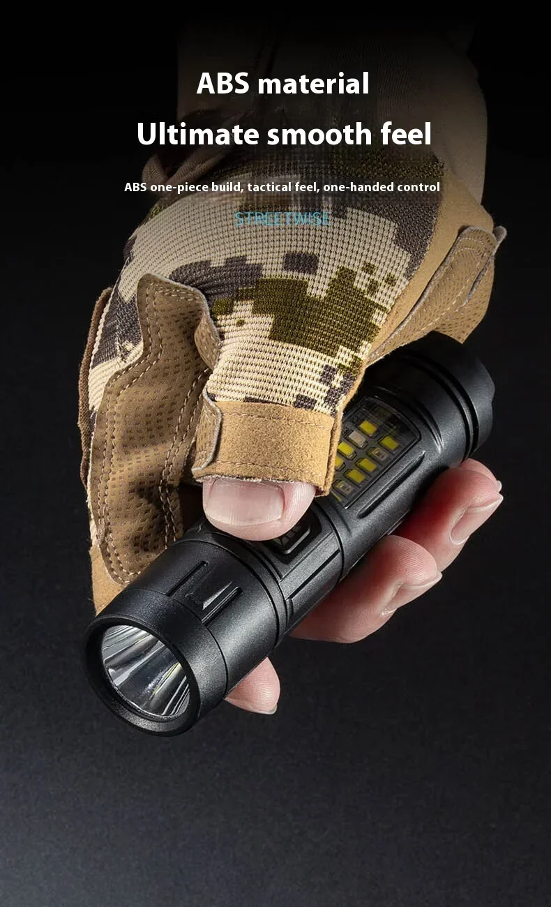 The ZHENAO CY-011 is a versatile rechargeable LED flashlight engineered for outdoor enthusiasts. Featuring a primary LED main light paired with 8 white side LEDs and 4 red accent LEDs, this compact torch delivers adaptive illumination for fishing, hunting, camping, and emergency situations. Weighing just 53g with dimensions of 12.1×3×3cm, it's highly portable without sacrificing performance. The durable ABS construction with IPX4 waterproof rating withstands challenging environments. Seven operational modes let you switch between high and low intensity settings, flashing modes, and dedicated red light functions—simply hold any mode for 5 seconds to power down. The built-in battery charges via Type-C USB, ensuring convenient recharging anywhere. Press-button operation provides intuitive control in the field.