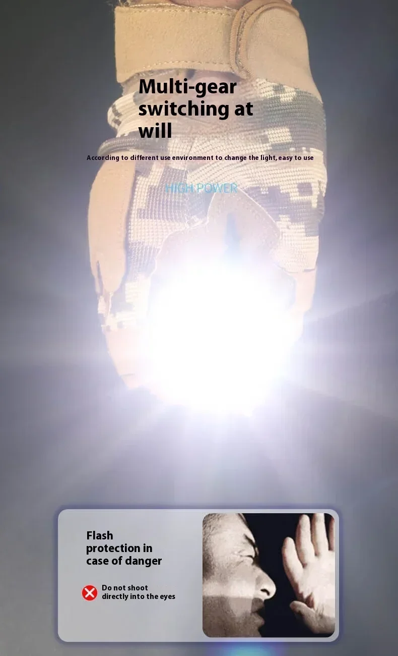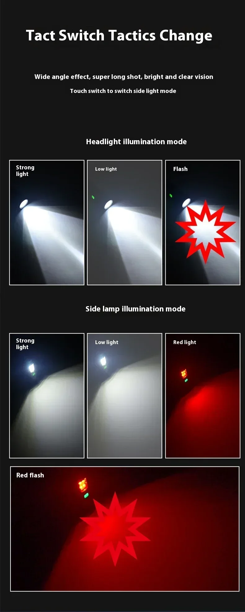 Gear mode: Seventh gear: main light strong light-main light weak light-main light flashing -8*LED white strong light -8*LED white weak light -4*LED red light -4*LED red light flashing.Stay in any gear for 5 seconds and press it again to turn it off