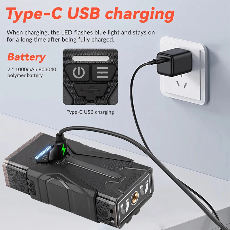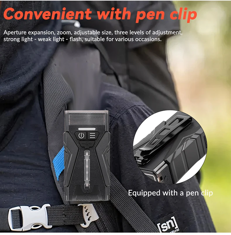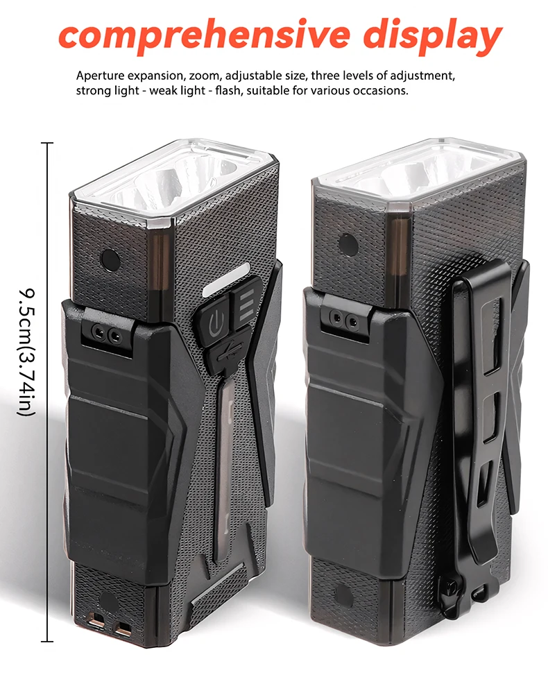 The ZHENAO M19 tactical flashlight delivers professional-grade illumination with versatile lighting modes for demanding outdoor applications. Featuring a powerful 3-LED main light with six intensity levels—from subtle weak light to intense strong output—plus dedicated SOS and strobe functions, this flashlight adapts to any situation. The integrated 24-LED yellow side lamp provides supplementary illumination, while six RGB LEDs offer dynamic color options including white, red, green, blue, purple, and mesmerizing rainbow flowing effects. Dual 1000mAh polymer batteries (2000mAh total) ensure extended runtime, with convenient Type-C USB charging. Built from durable PC material and rated IPx4 waterproof, the M19 withstands harsh conditions. Intuitive double-press and long-press controls enable seamless mode switching, with an 8-second auto-shutoff safety feature. At just 146g and compact 9.5×5×3.3cm dimensions, this tactical light combines portability with professional performance for camping, hiking, and emergency preparedness.