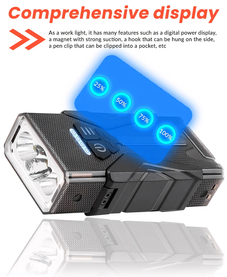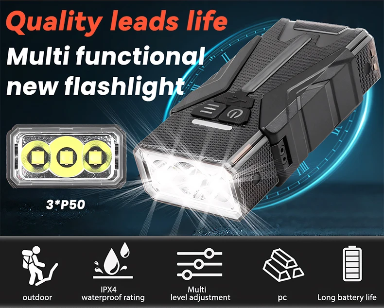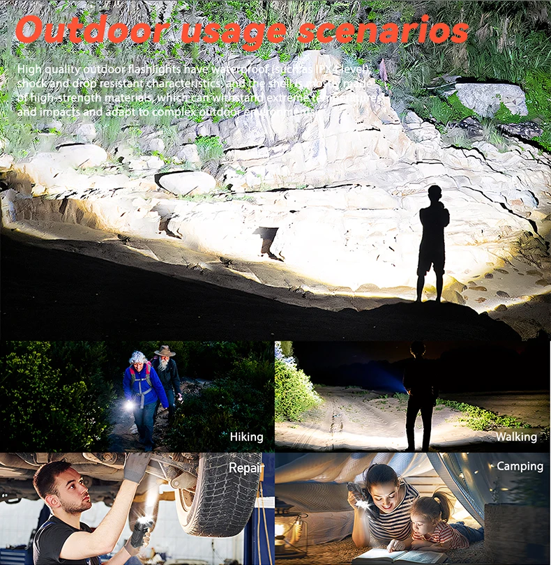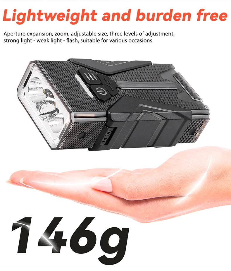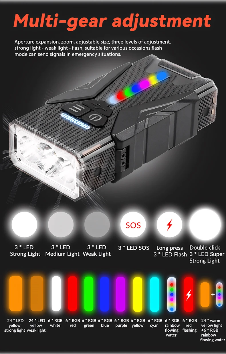 Switch modes: Main Light Level 6: 3 * LED Strong Light-3 *LEDMedium Light -3*LED Weak Light-3*LED SOS- Long Press 3*LED Flash -Double Click3 * LED Super Strong Light.