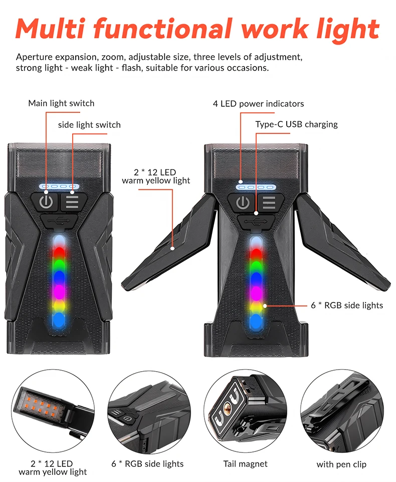 Tactical Flashlight with RGB & Side Lamp, Zoomable High Lumens, Magnetic Base & Clip for Outdoor Camping Hiking M19