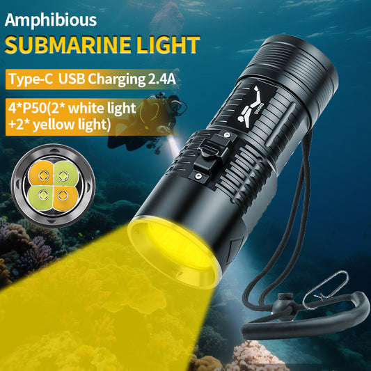 High Bringhtiness amphibious flashlight professional night diving lighting 30W LED white light+yellow long-range flashlight