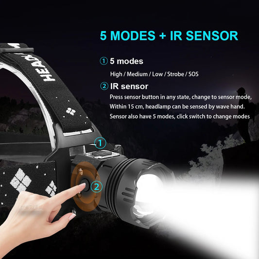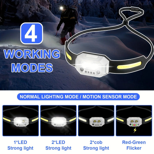 Most Powerful COB+LED Headlamp Smart Motion Sensor Headlight Waterproof Head Lamp Rechargeable Head Light with Built-in Battery