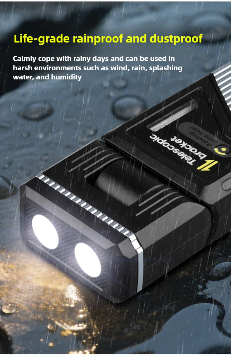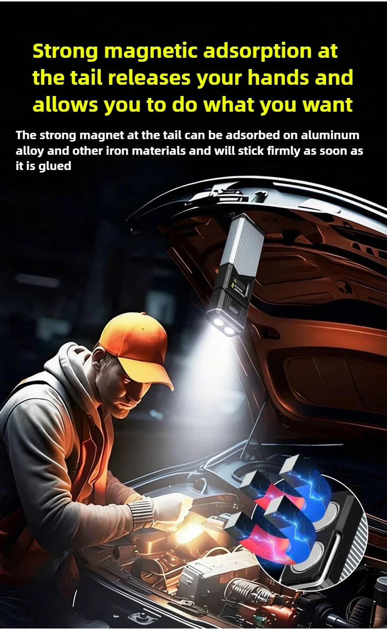 The ZHENAO K2506 is a versatile LED work light engineered for demanding outdoor and indoor applications. Featuring dual XTG main lights paired with four LED side lights (two white, two red), this compact powerhouse delivers adaptive illumination across seven distinct modes—from maximum brightness to SOS signaling. The 180° rotatable design and 33cm extension capability provide flexible positioning for any task. Built from durable aluminum alloy and ABS, it withstands IPX4 water exposure. The integrated 1400mAh polymer battery supports 4.5 to 24 hours of runtime depending on mode selection, charging fully in 3-5 hours via USB Type-C. Weighing just 134g, this magnetic work light is the reliable companion for camping, repairs, emergencies, and professional use.