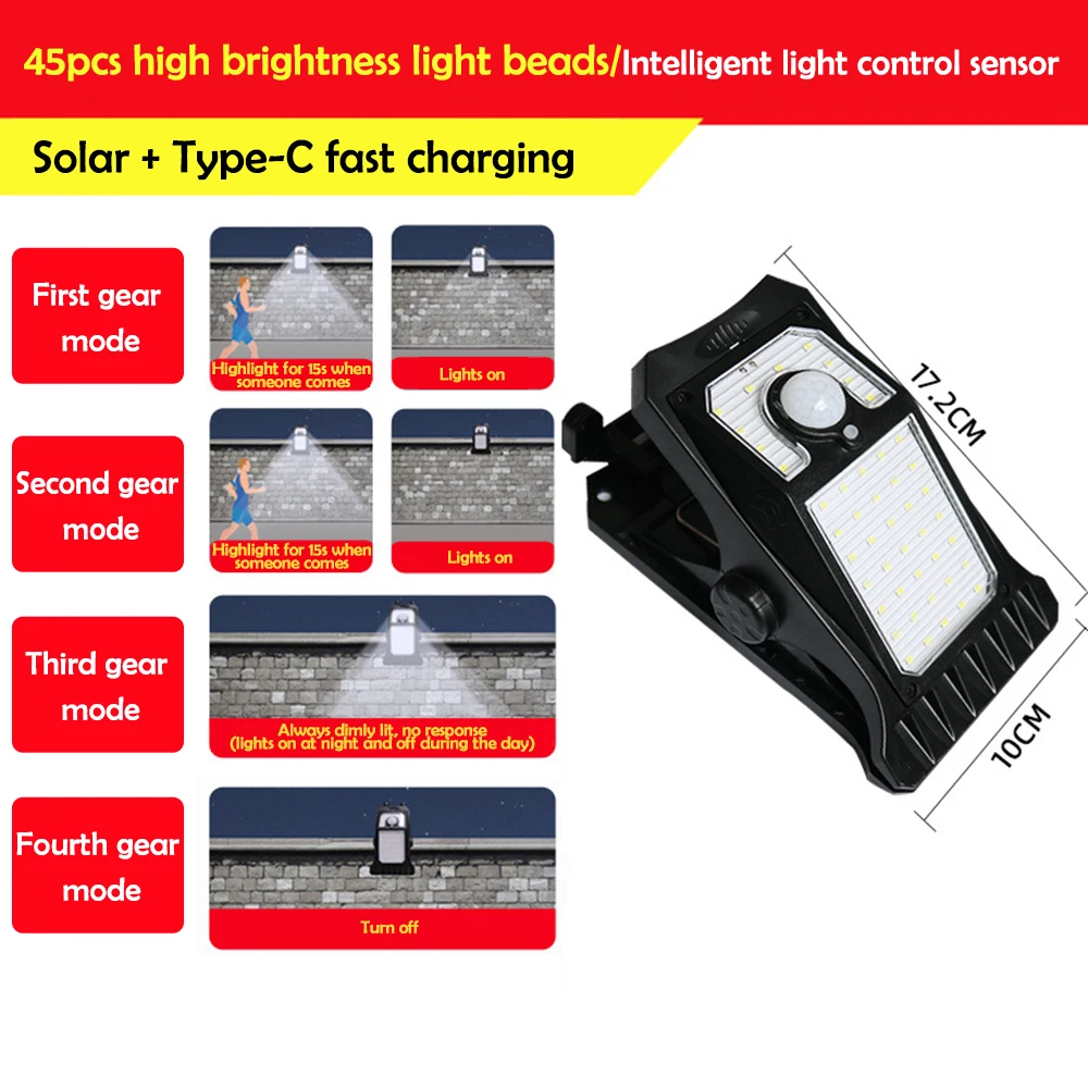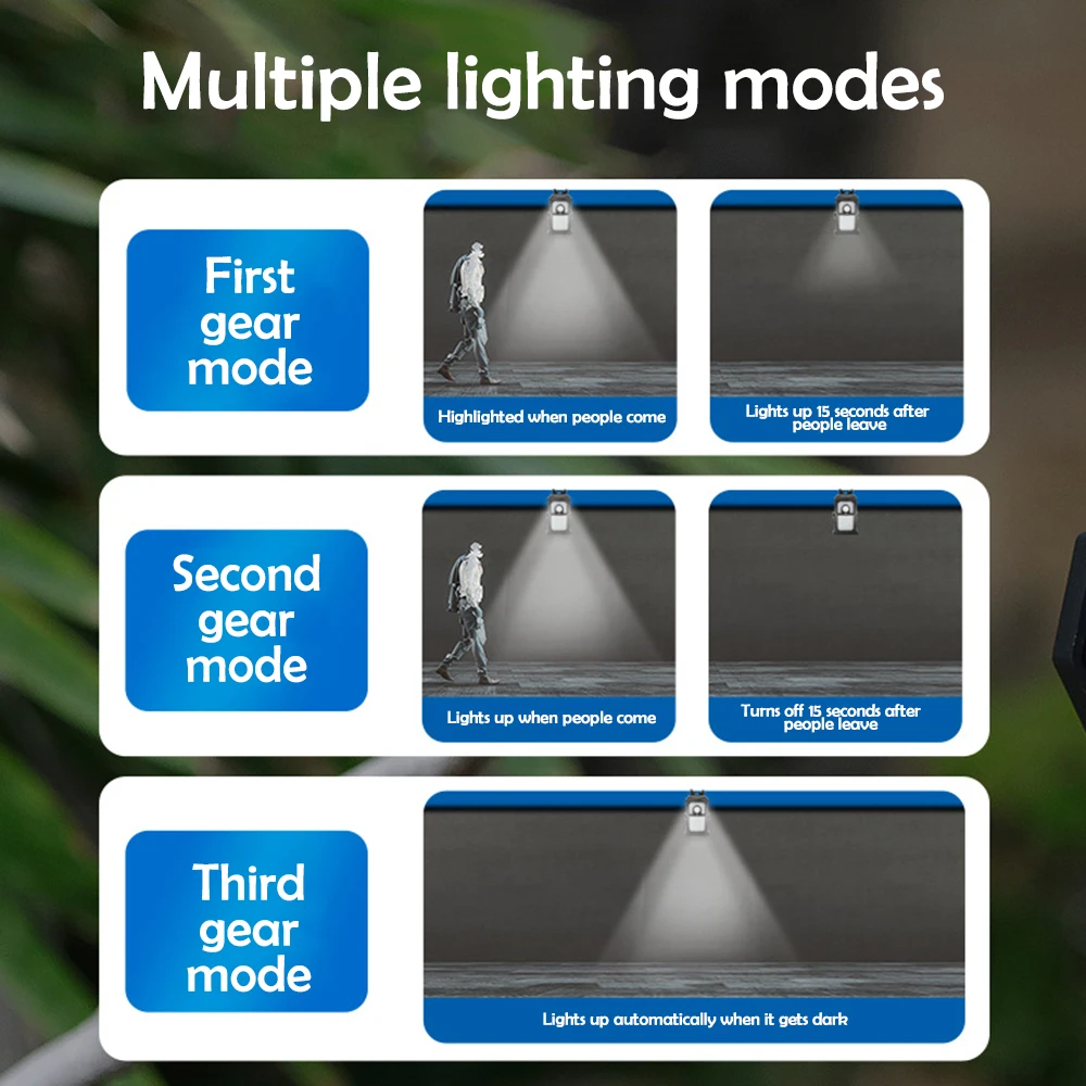 Switch modes: Three levels: 1. When it gets dark, it senses strong light when a person passes by, and automatically turns off 20 seconds after the person leaves 2. When it gets dark, it senses strong light when people pass by, and after 20 seconds of leaving, it turns into weak light and remains bright 3.Constant light mode: Medium light stays on at night and automatically turns off at dawn