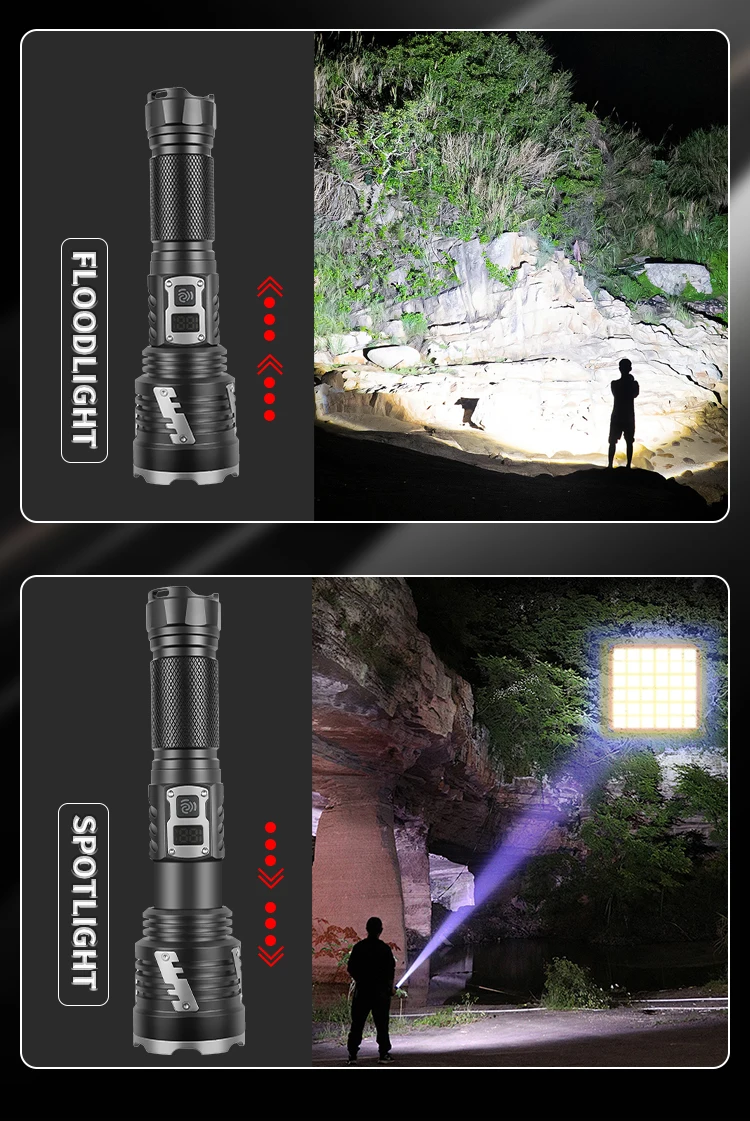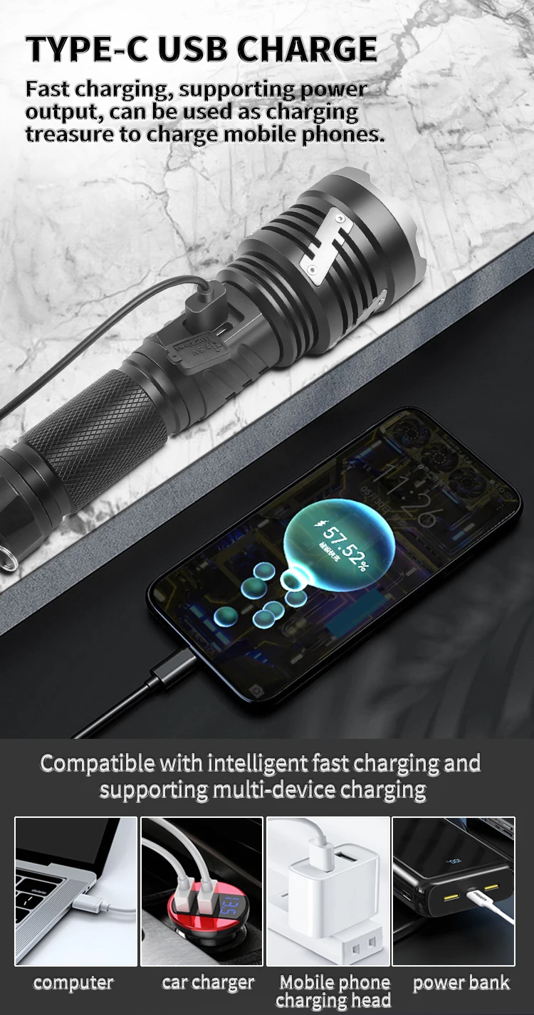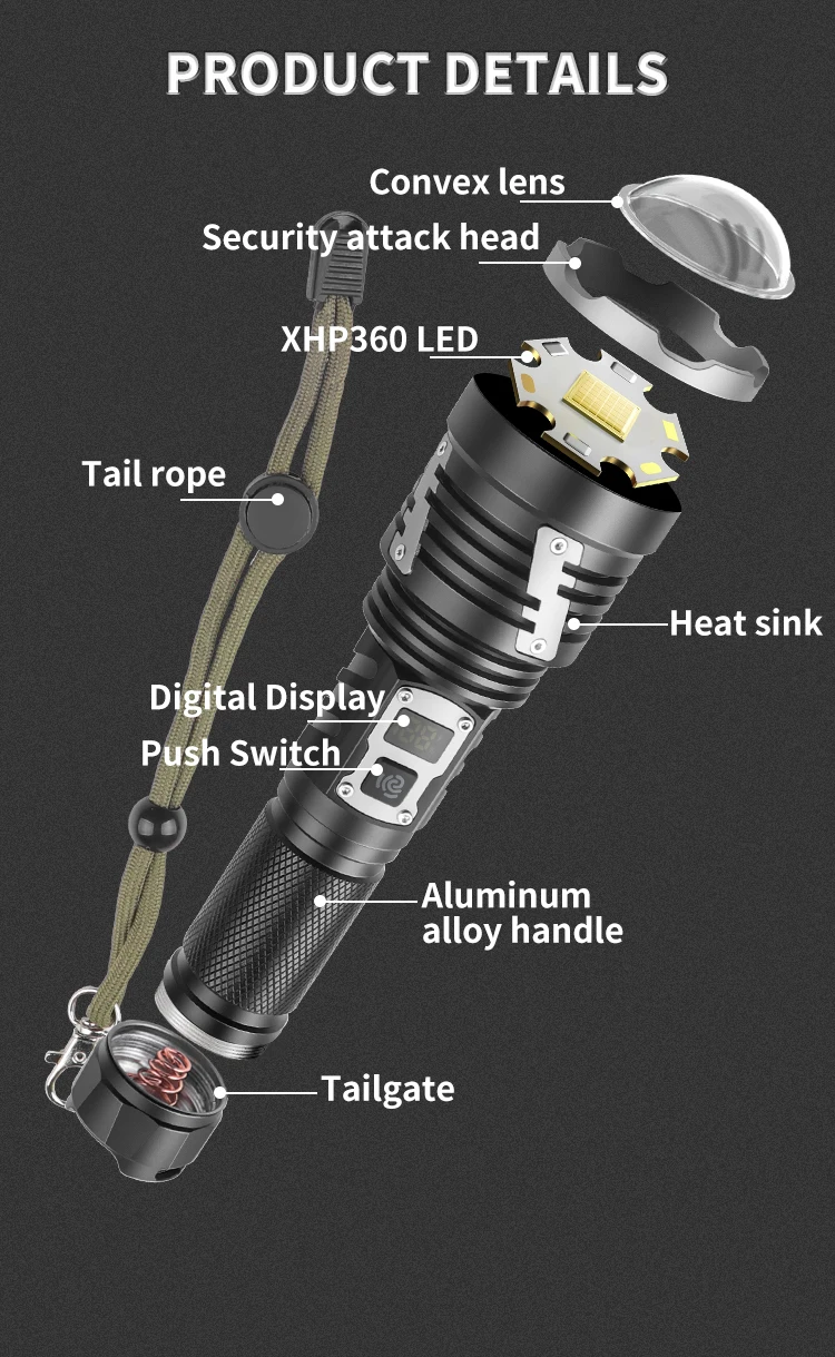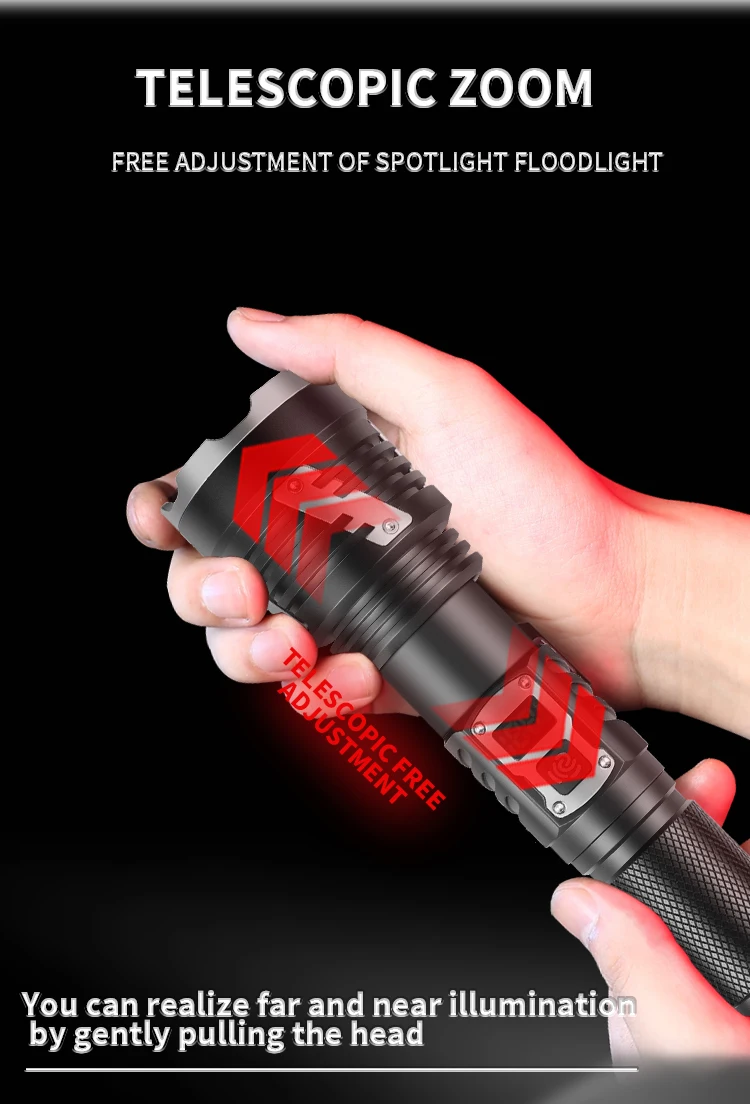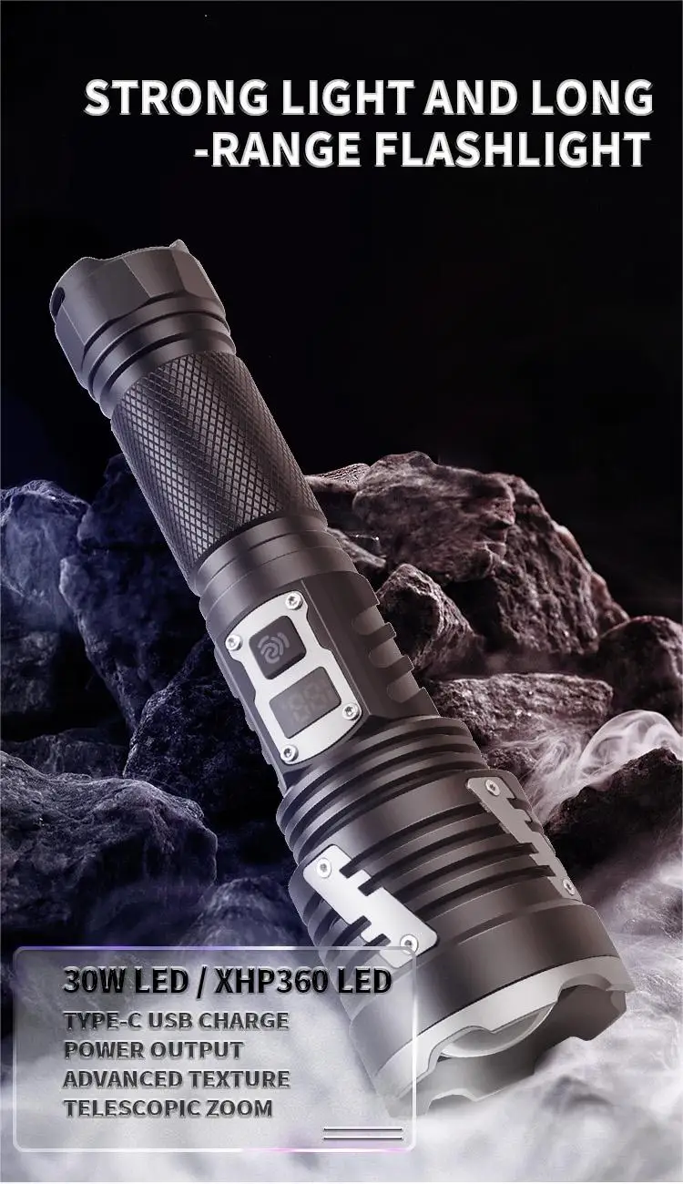 The ZHENAO 1426A delivers professional-grade illumination with its 30W XHP360 LED, producing exceptional brightness for demanding applications. Engineered from durable aluminum alloy, this compact 272g flashlight features telescopic zoom capability and five operational modes—high, medium, low, strobe, and SOS—accessible via intuitive push switch controls. IPX4 waterproof rating ensures reliable performance in wet conditions, while Type-C USB charging and compatibility with 18650 or 26650 batteries provide flexible power solutions. Measuring 19×5.3×3.3cm, it's portable yet powerful enough for camping, emergency response, search operations, and professional fieldwork. Built for durability and versatility, this rechargeable torch combines cutting-edge LED technology with practical outdoor functionality.