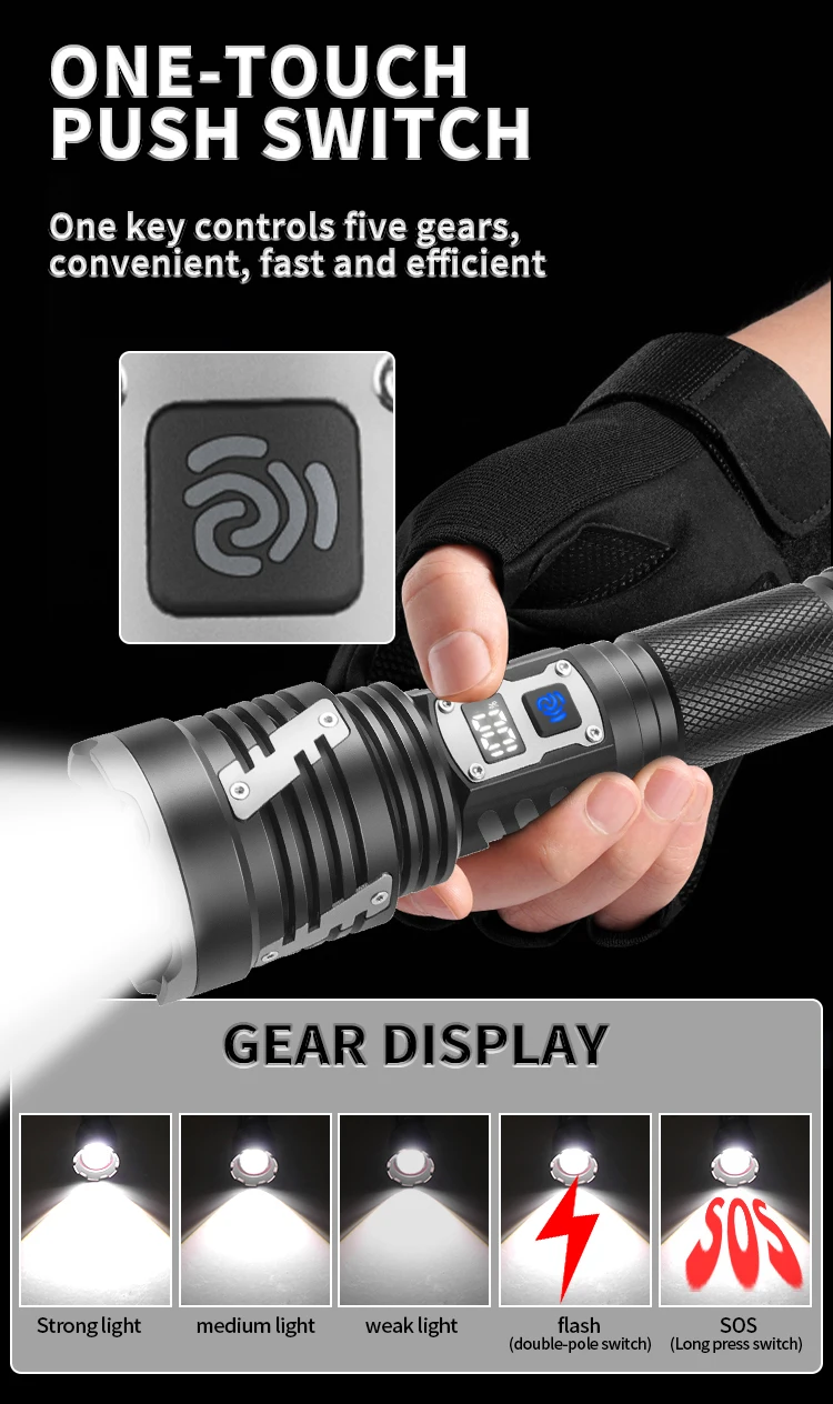 Gear mode: Fifth gear: strong light-medium light-weak light-double-click to turn on flash-long press to turn on SOS