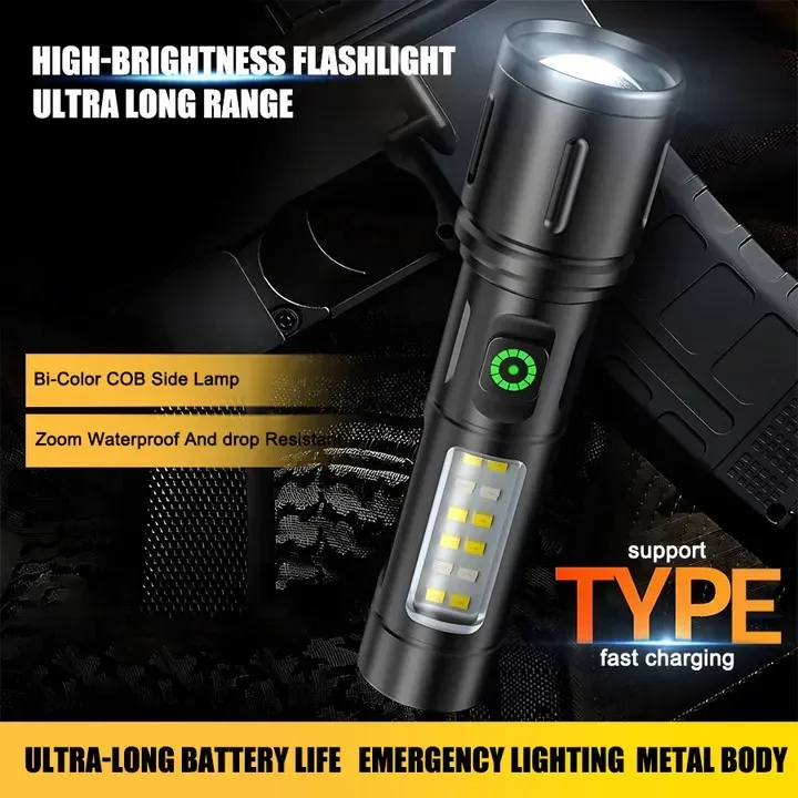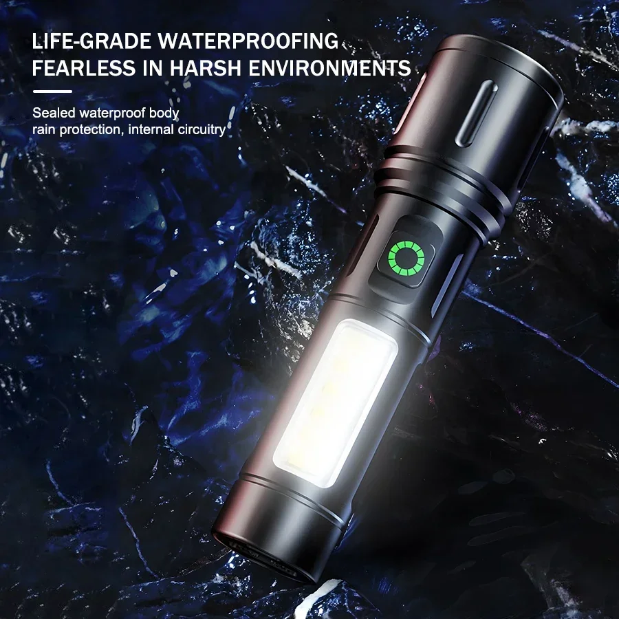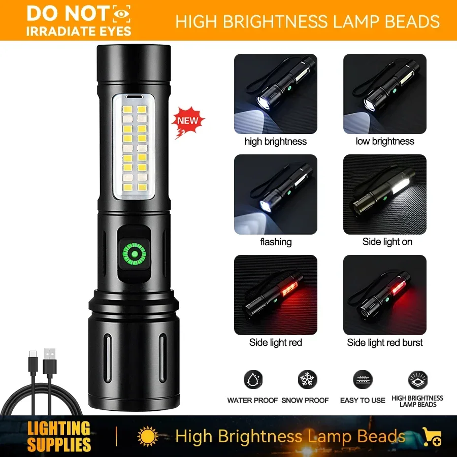 The ZHENAO 1437 is a versatile, high-performance LED flashlight designed for outdoor enthusiasts. Featuring a 30W LED main light plus 12 white and 6 red LEDs, it offers six adjustable modes including strong, weak, and flashing lights for varied visibility needs. Crafted from durable aluminum alloy and weighing just 138g, this compact torch (3.6 x 3 x 14 cm) includes a built-in 1200mAh rechargeable battery with convenient Type-C USB charging. Its IPX4 waterproof rating ensures reliable use in damp conditions, making it ideal for camping, riding, and other outdoor activities.