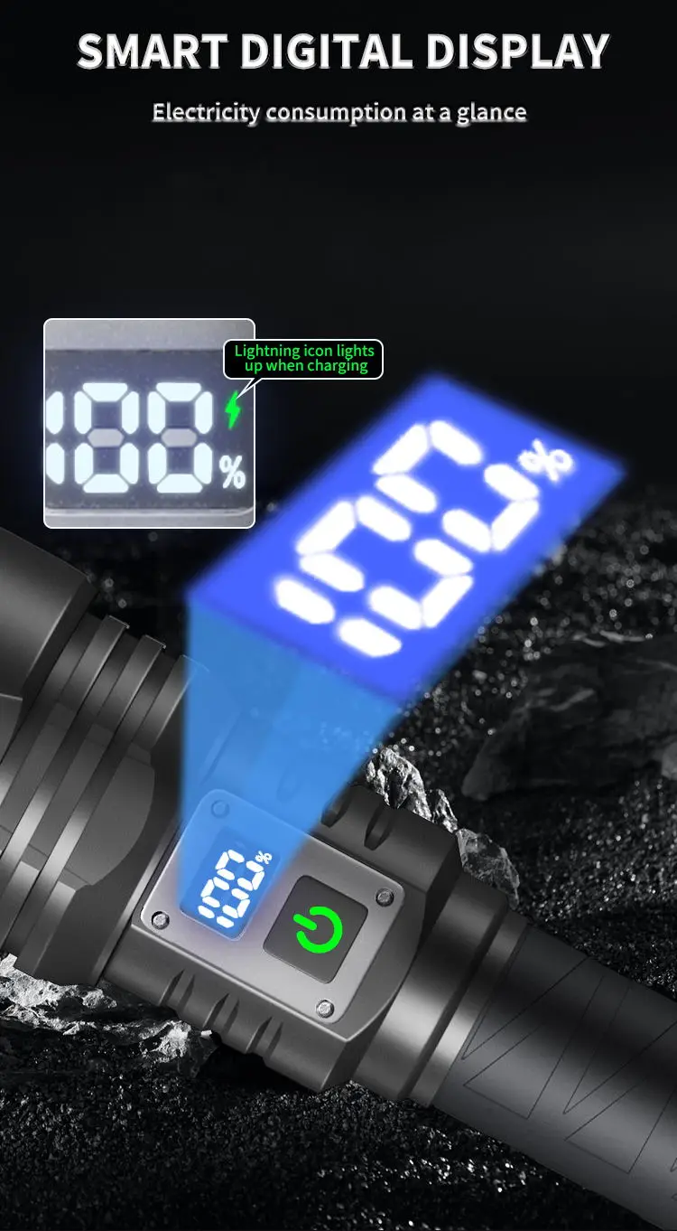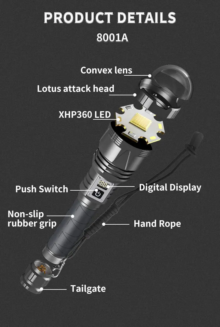 This ZHENAO rechargeable flashlight features a powerful XHP360 LED and a 60W LED option, delivering intense brightness with multiple lighting modes including strong, medium, low, strobe, and SOS. Crafted from durable aluminum alloy and rated IPX4 waterproof, it’s built to endure outdoor conditions. The flashlight supports Type-C USB charging and telescopic zoom for precise beam control. With two battery size options (18650 or 26650, batteries sold separately), it offers long-lasting performance in a compact, lightweight design ideal for emergencies, work, or outdoor activities.