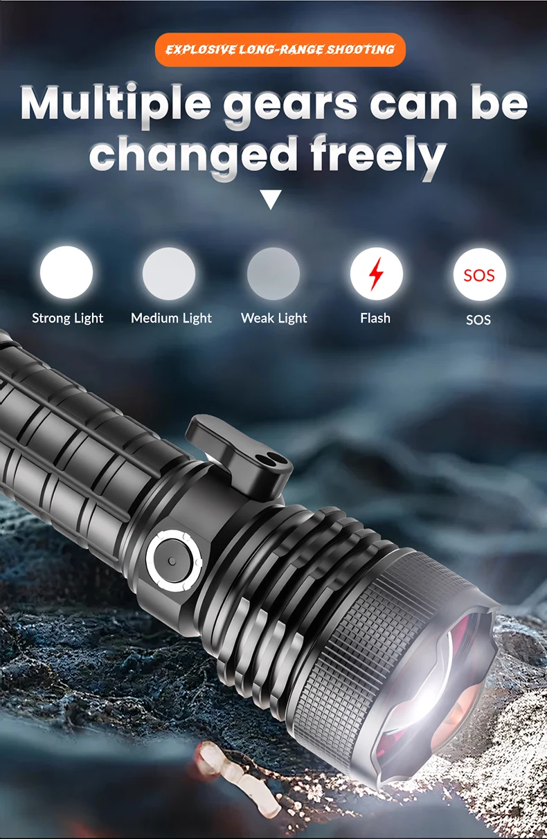 Switch modes: Five levels:Strong light-Medium light-Weaklight-Flashflash-SOS