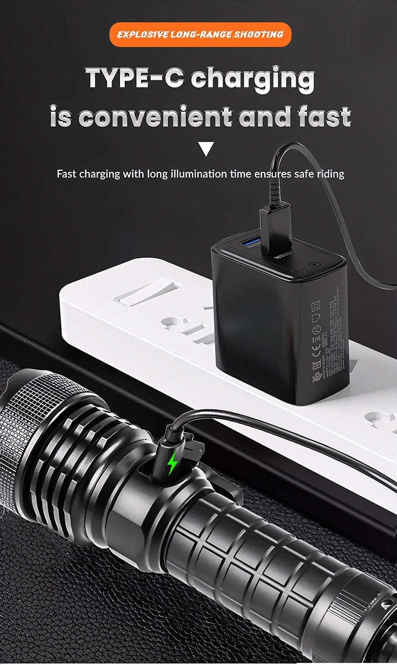 Multifunctional XHP160 Ultra-Bright LED Flashlight Type-C Charging High-Intensity Beam & Emergency Window-Breaking Tool