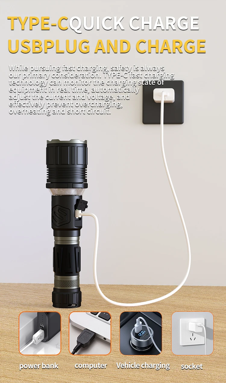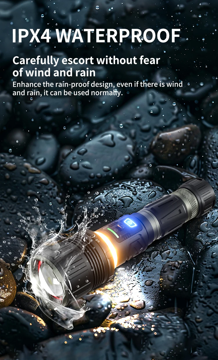 The ZHENAO F460 50W white laser flashlight combines powerful illumination with versatile lighting modes for professional use. Featuring a 50W main LED and 16 side LEDs (white, orange, and red), it delivers adjustable brightness and multiple flashing signals for varied conditions. Its lotus-shaped head is engineered to break windows in emergencies. Constructed from durable aluminum alloy and PC, this IPX4 waterproof flashlight offers long battery life (up to 190 hours on side lights) powered by a 26800 battery (not included) and supports fast Type-C charging. Compact and robust, it’s ideal for demanding environments.