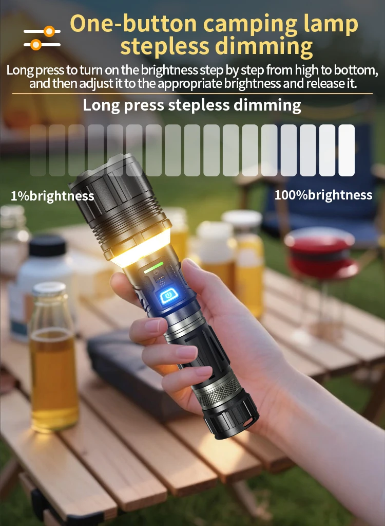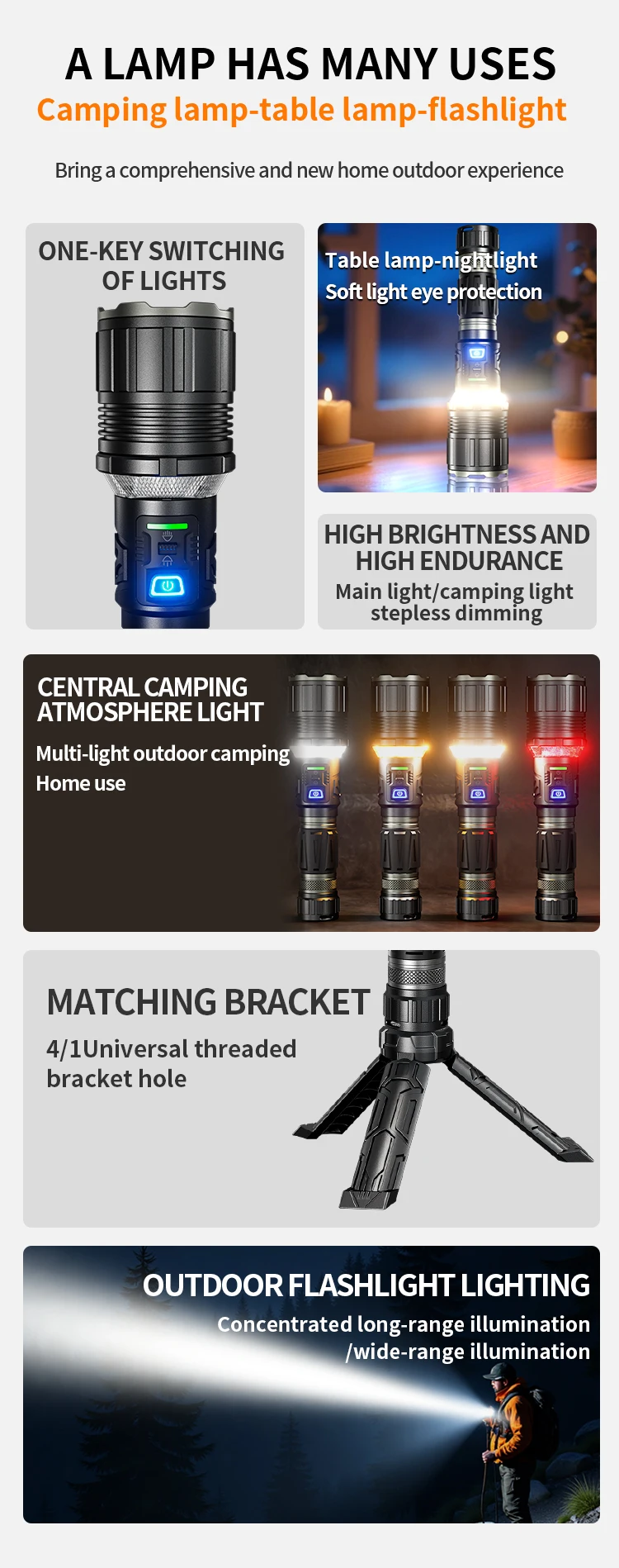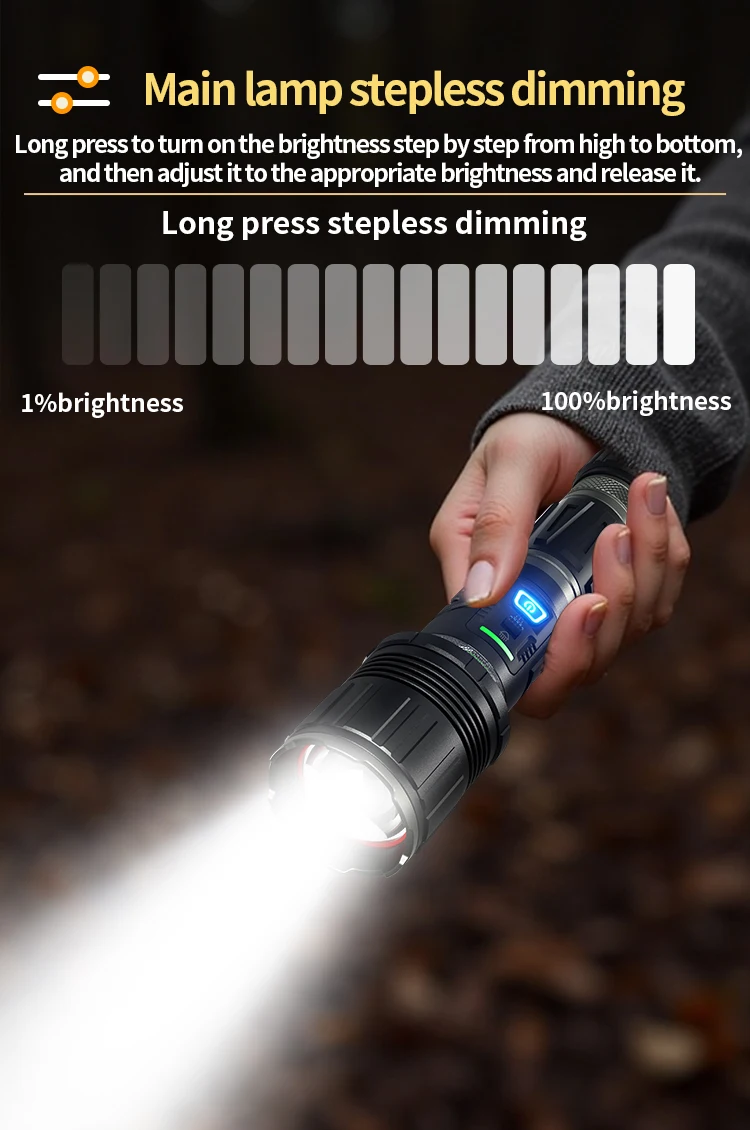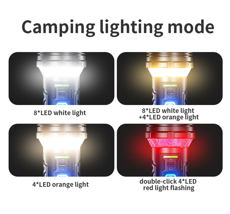 GEAR MODE:Main light: strong light-medium light-weak light -SOS- double-click to flashSide light: 8*LED white light -8*LED white light +4*LED orange light-4*LED orange light-double-click 4*LED red light flashing.The main light can be dimmable by long press except for low light andflash gear, and the side light can be dimmable except for red flash gear.Stay in any gear for 5 seconds and press it again to turn it off.