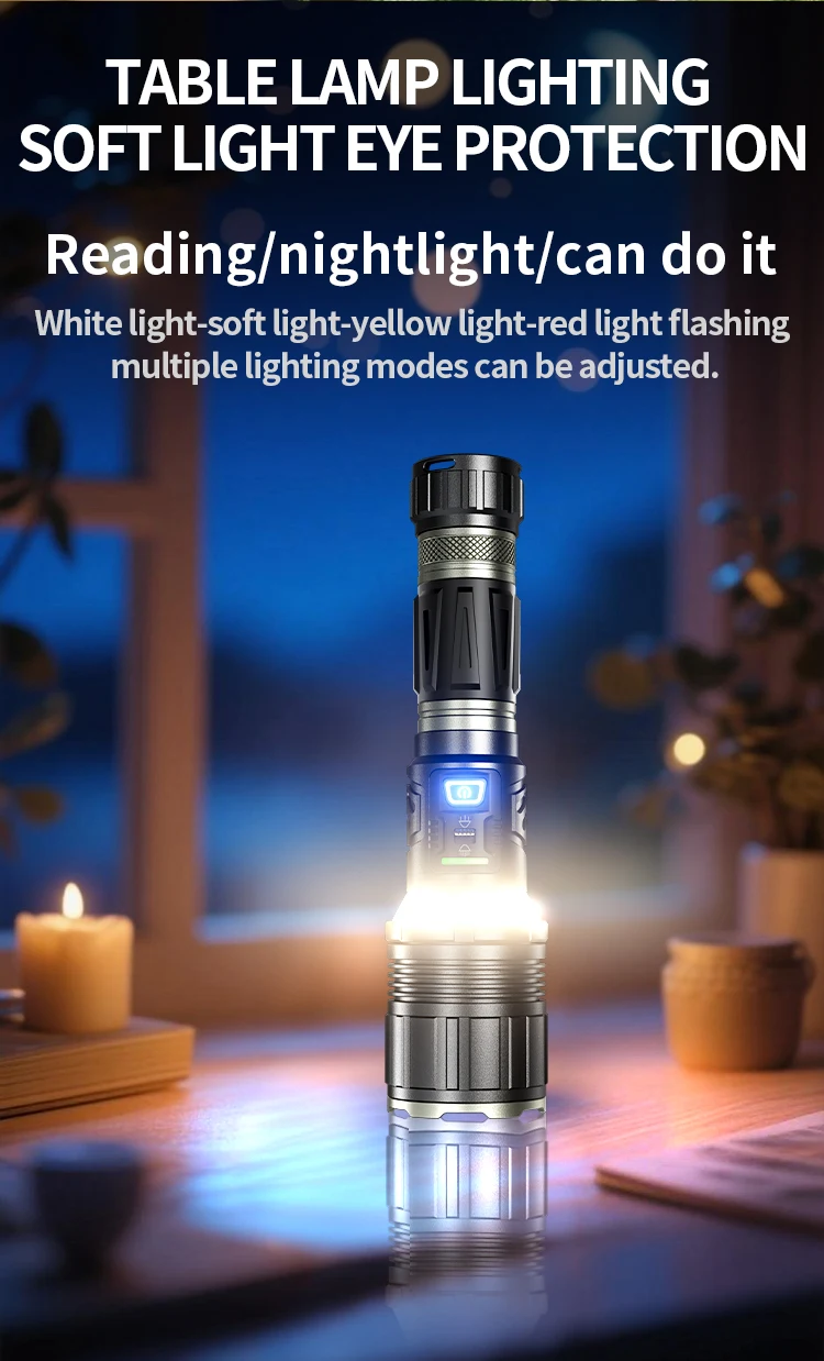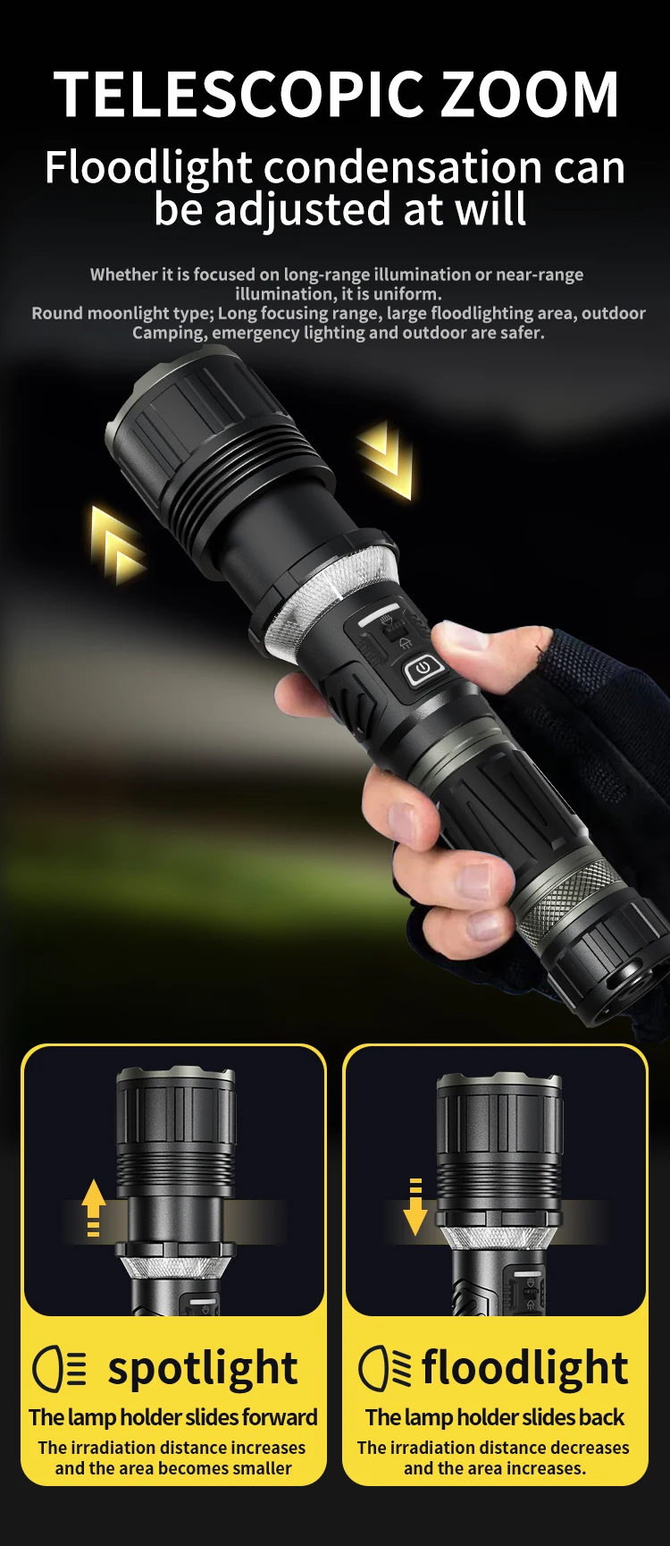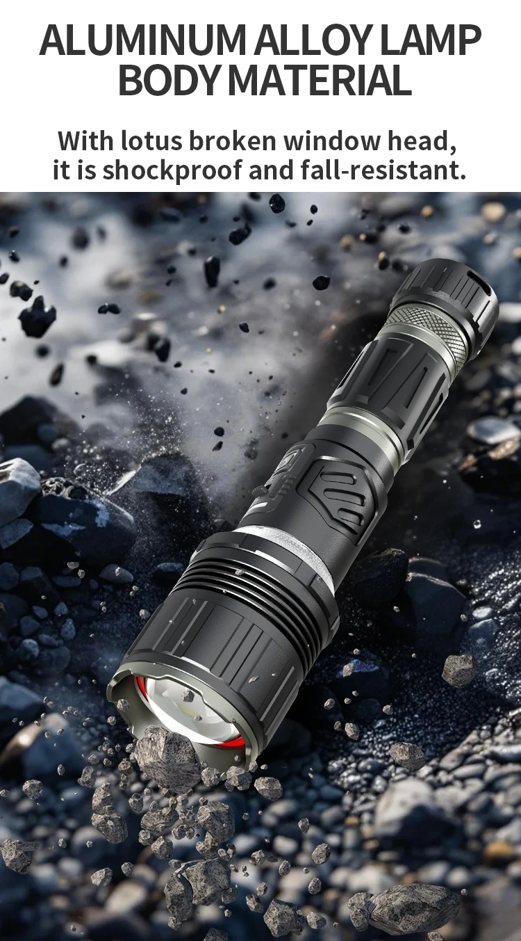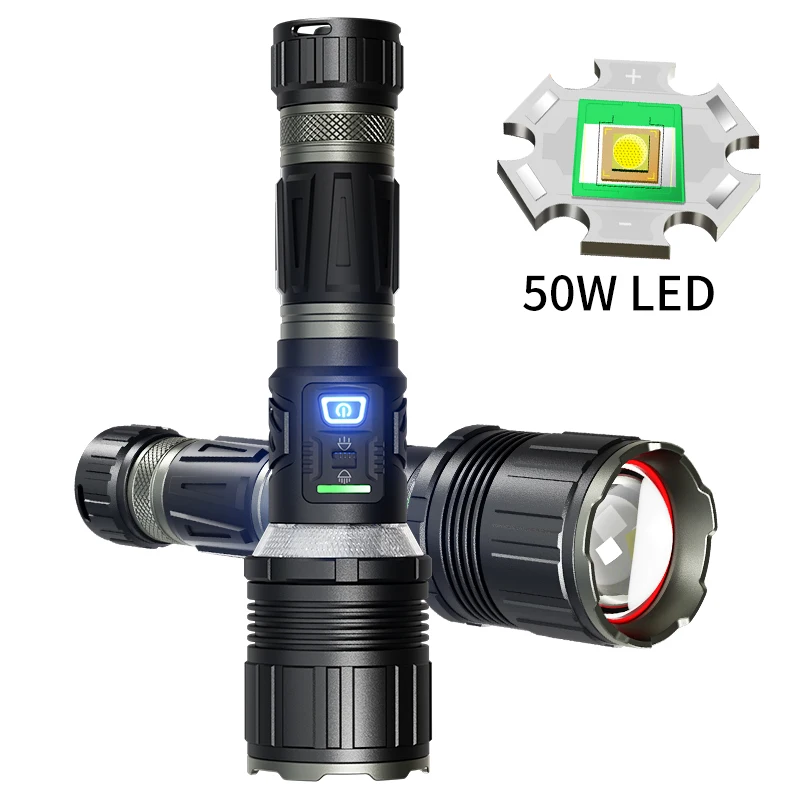 50W white laser flashlight that is extremely bright and has long-range capabilities. The lotus-shaped head can break windows