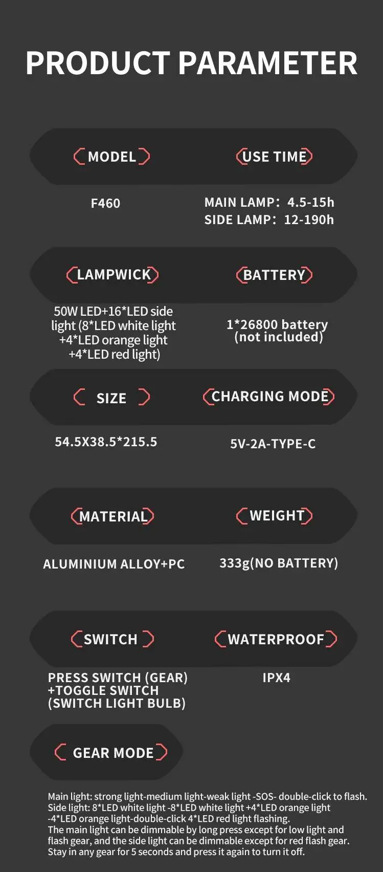 USE TIME:MAIN LAMP:4.5-15h SIDE LAMP:12-190h