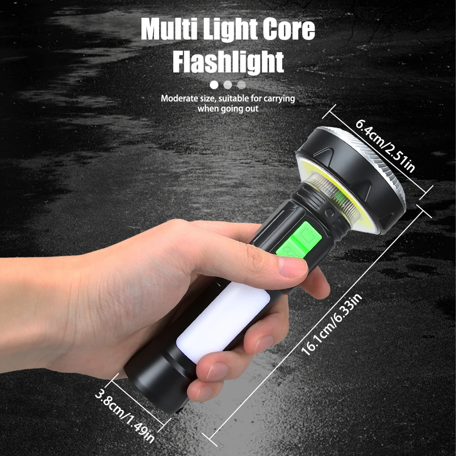 The ZHENAO JB-8+1 represents a comprehensive lighting solution engineered for demanding outdoor applications. This advanced flashlight integrates 9 primary LEDs with 8 auxiliary LEDs, delivering 11 distinct lighting modes across main and side illumination systems. The configuration includes 8 white LEDs, 8 COB white lights, and 8 COB red lights, accessible through dedicated switches for tactical flexibility. Built from durable ABS and polycarbonate materials, the unit achieves IPX4 waterproof certification for reliable performance in variable conditions. Measuring 16.5×6.4×3.8cm and weighing just 134g, it balances capability with portability. The rechargeable 1200mAh polymer battery supports Type-C USB charging with power bank output functionality, extending utility beyond illumination. Seven main light modes—from maximum intensity to SOS signaling—combined with four COB side light configurations, provide specialized options for camping, emergency response, and professional fieldwork. The compact form factor and multi-spectrum output make this an essential tool for outdoor enthusiasts and professionals requiring versatile, dependable lighting.