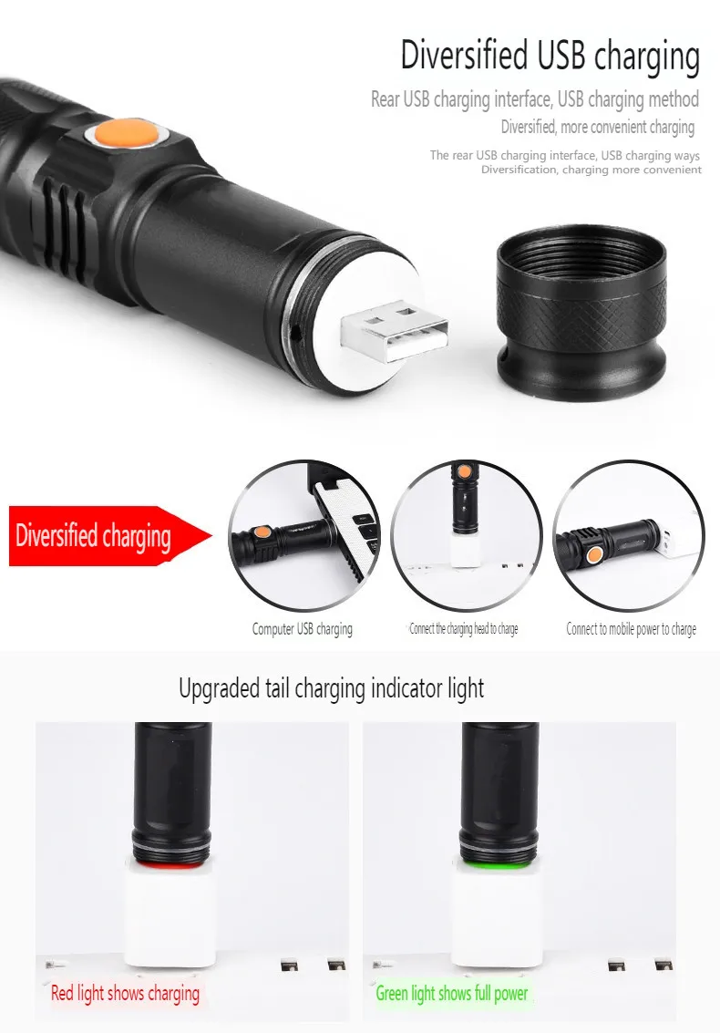 Aluminum alloy LED flashlight outdoor portable night fishing strong light flashlight USB charging handheld flashlight