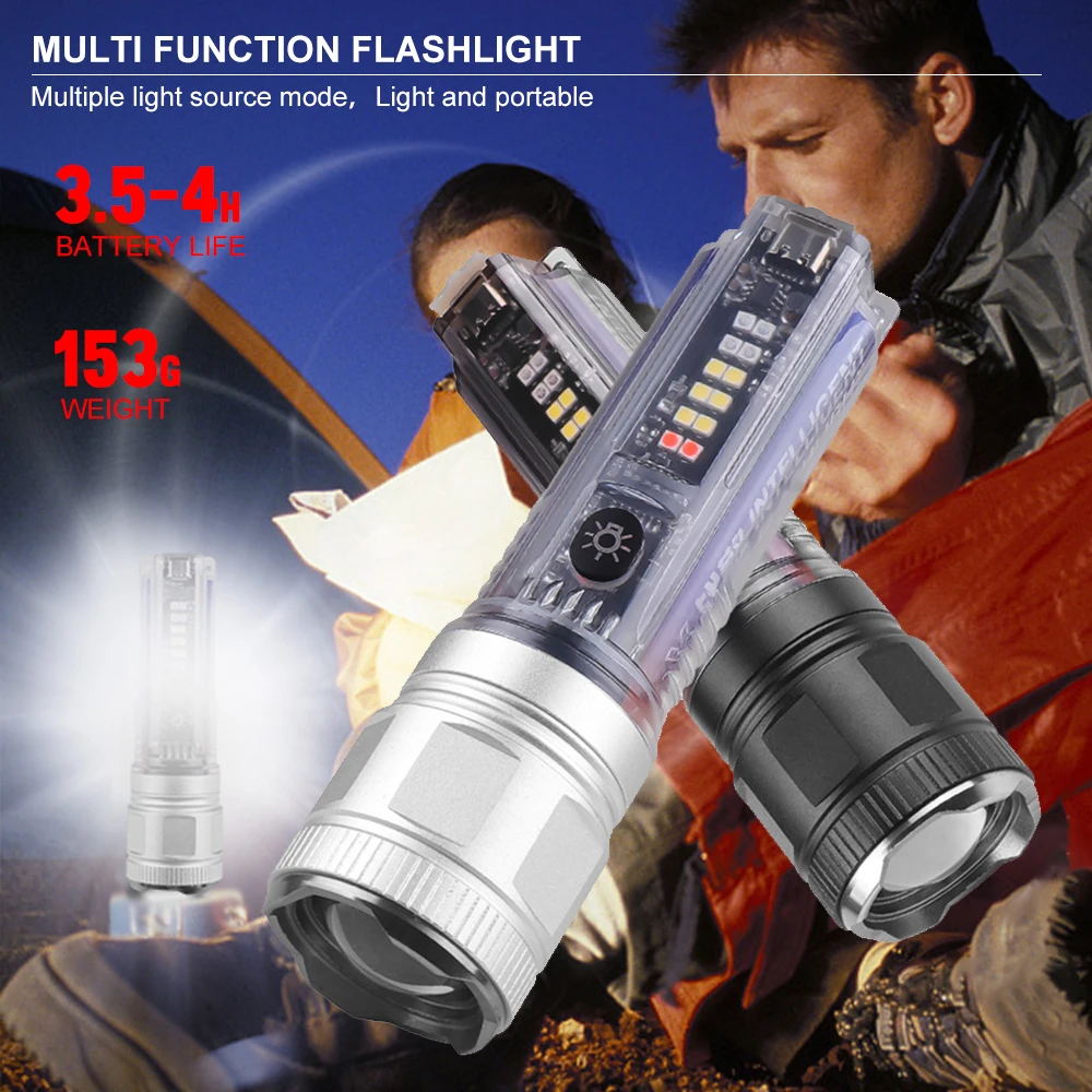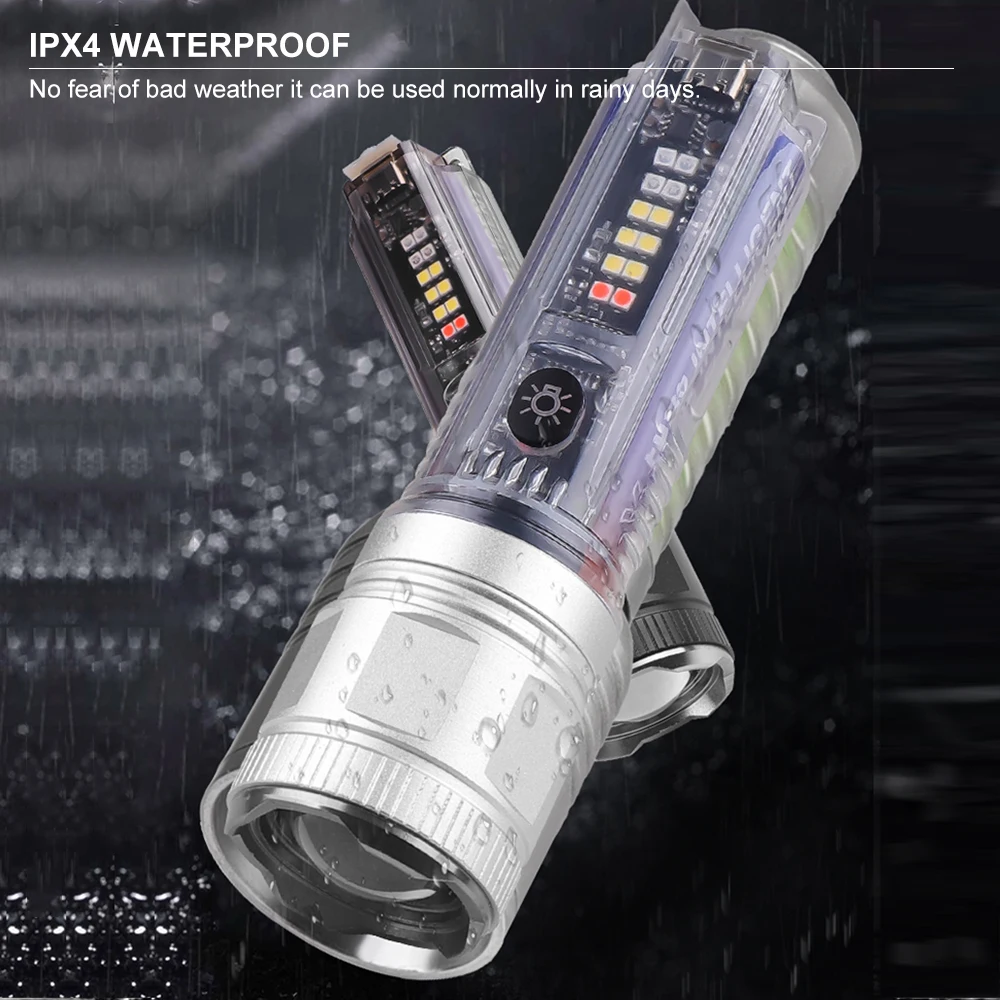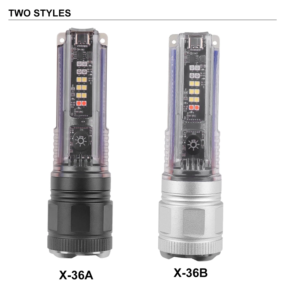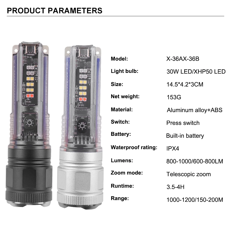 The ZHENAO X36 is a versatile tactical flashlight engineered for demanding applications. Built from durable aluminum alloy and ABS, this compact 153g unit features dual lighting systems: an XHP50 LED paired with a 30W LED, delivering up to 1200m beam range and 1000 lumens output. The telescopic zoom mechanism allows precise beam adjustment from flood to spot configurations. Seven switchable modes per LED system provide tactical flexibility—from high-intensity white light to specialized UV, purple, and blue wavelengths for detection and signaling. IPX4 waterproofing ensures reliable performance in wet conditions. Powered by an integrated 18650 battery with Type-C USB charging, this professional-grade torch combines portability with exceptional versatility for search, rescue, inspection, and specialized lighting needs.