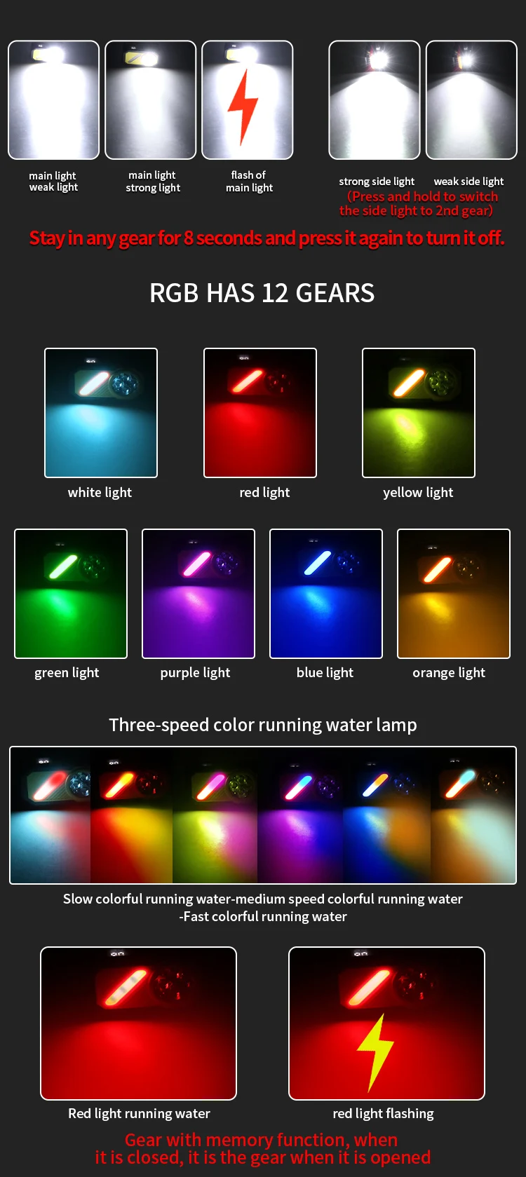 2. Click to turn the RGB light on/off when it is turned off, and press and hold to switch gears: white light-red light-yellow light-green light-purple light-blue light-orange light-slow colorful water-medium colorful water-fast colorful water-red water-double-click red light flashing. RGB can't sense, and when RGB can't be tumed on at the same time as the main light andside light, any gear stays for 8 seconds and presses the switch again to tum it off, with memory function. What gear is tumed on again before turning it offor before tuming it off?