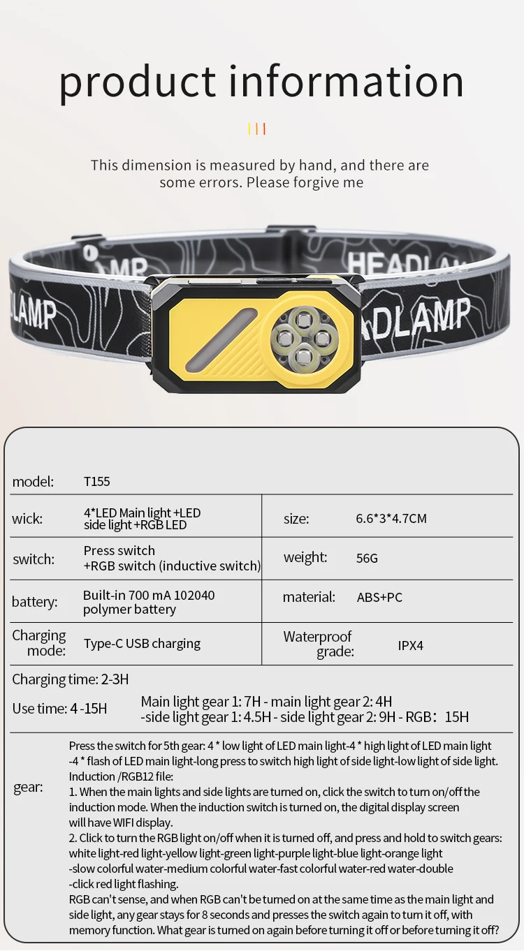 The ZHENAO T155 is a versatile 6-in-1 headlight flashlight engineered for demanding users. Featuring a powerful 400-lumen main LED with adjustable side lighting and 12-mode RGB functionality, this compact tool delivers precision illumination for any task. The inductive dimming switch provides intuitive control, while the IPX4 waterproof rating ensures durability in challenging conditions. Powered by a built-in 700mAh polymer battery with Type-C fast charging (2-3 hours), it offers extended runtime up to 15 hours depending on mode selection. Weighing just 56g and measuring 6.6×3×4.7cm, the T155 combines portability with professional-grade performance in a lightweight ABS+PC construction.