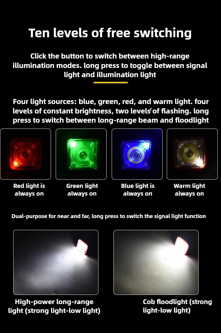 Switch Modes:Side light gear: LED warm yellow light LED red light LED green light LED blue light -4 * LED horse flashing-red light+blue light alternately flashing 4 * LED flash Long press to switch to the fourth gear of the main light: XPG strong light XPG weak light - COB strong light -COB weak light