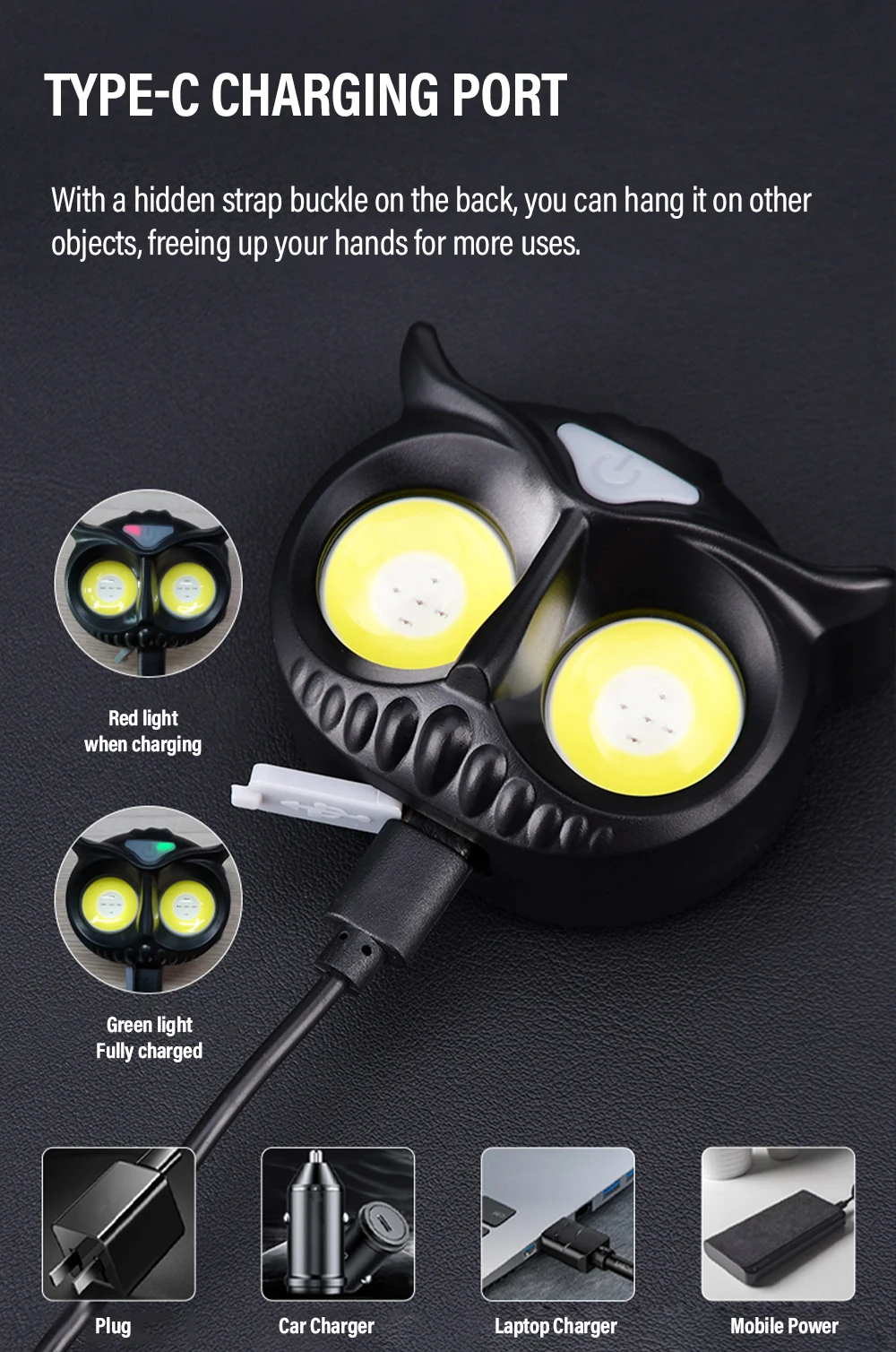 COB Owl Headlamp Waterproof USB Rechargeable Headlight with Hook and Magnetic for Adults Children Running Fishing Riding Camping